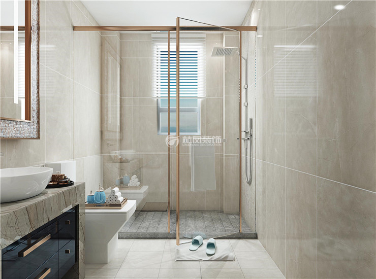 整体采用灰调的瓷砖,搭配带有金属边的玉屏,让空间有一种高级感。干湿分区的设计更加的增加了实用性。