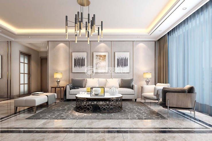 本案的客厅电视墙面采用天然爵士白大理石对拼造型做形象墙,提升会客区的豪华感与庄重,吊棚采用圈棚拉缝夹拉丝钢条点缀棚顶效果,在叠层增加立体感。沙发背景用深棕色硬包做主墙面区域,增加厚重感和整体的色彩协调。
