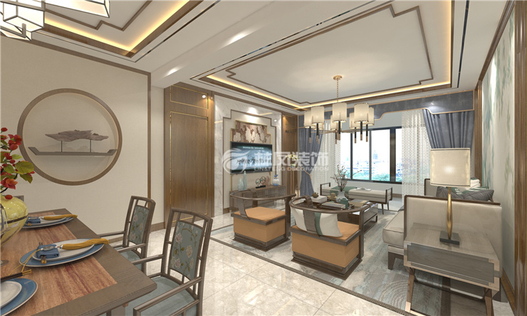 客厅整体颜色基本和传统中式相同,家具组合以实木为主 ,但在舒适度上会选择布艺县搭配,电视背景墙采用地砖上墙,然后木线收边,沙发背景墙采用壁纸与木线搭配,整体效果即有现代气息,又不失传统文化元素。