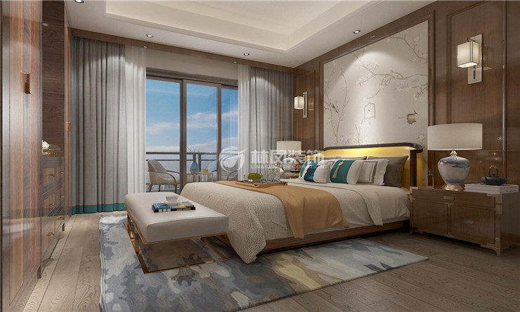 主卧室采用实木地板,墙面实木护墙板搭配壁纸,对于棚面则简单采用简单直线边棚,灯光照明方面考录作为无视设计,棚面只采用筒灯和灯带照明,不做主灯,墙面做壁灯,以及床头灯做辅助照明,整体颜色也以木色为主。