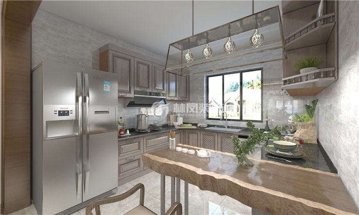厨房设计为开放式,橱柜做U型设计,增强厨房空间利用率,厨房与客厅之间做吧台,采用树干造型,既起到倒台作用又起到茶台做,墙面个采用灰色抛釉地砖上墙,增强现代感。