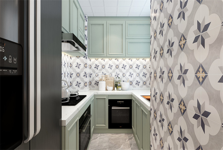 厨房采用了豆绿色橱柜和仿复古小花砖给人带来了时尚又温馨的感觉反而看起来更加宽敞明亮大气