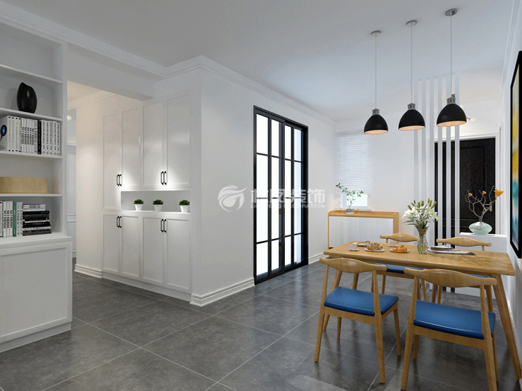 白色空间在原木色餐桌犹如回归自然,三头的简易吊灯与海浪图案挂画充满情调。